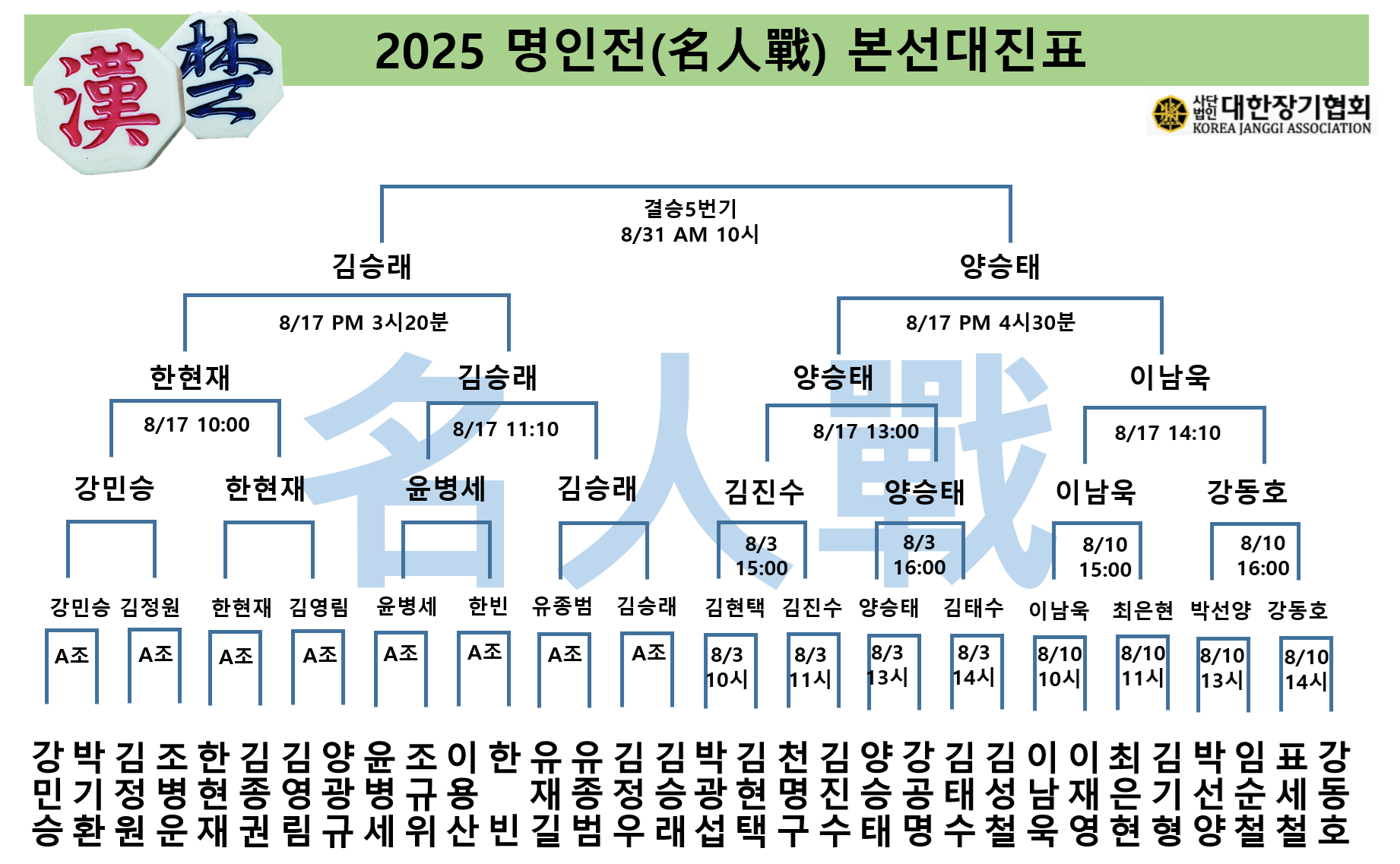 ¿À´Â 8¿ù 31ÀÏ ÀÏ¿äÀÏ ¿ÀÀü 10½Ã. À¯Æ©ºê ´ëÇÑÀå±âÇùȸTV¿¡¼ Á¦17ȸ ¸íÀÎÀü °á½Â 5¹ø±â ´ë±¹ÀÌ ¸·À» ¿Ã¸³´Ï´Ù.