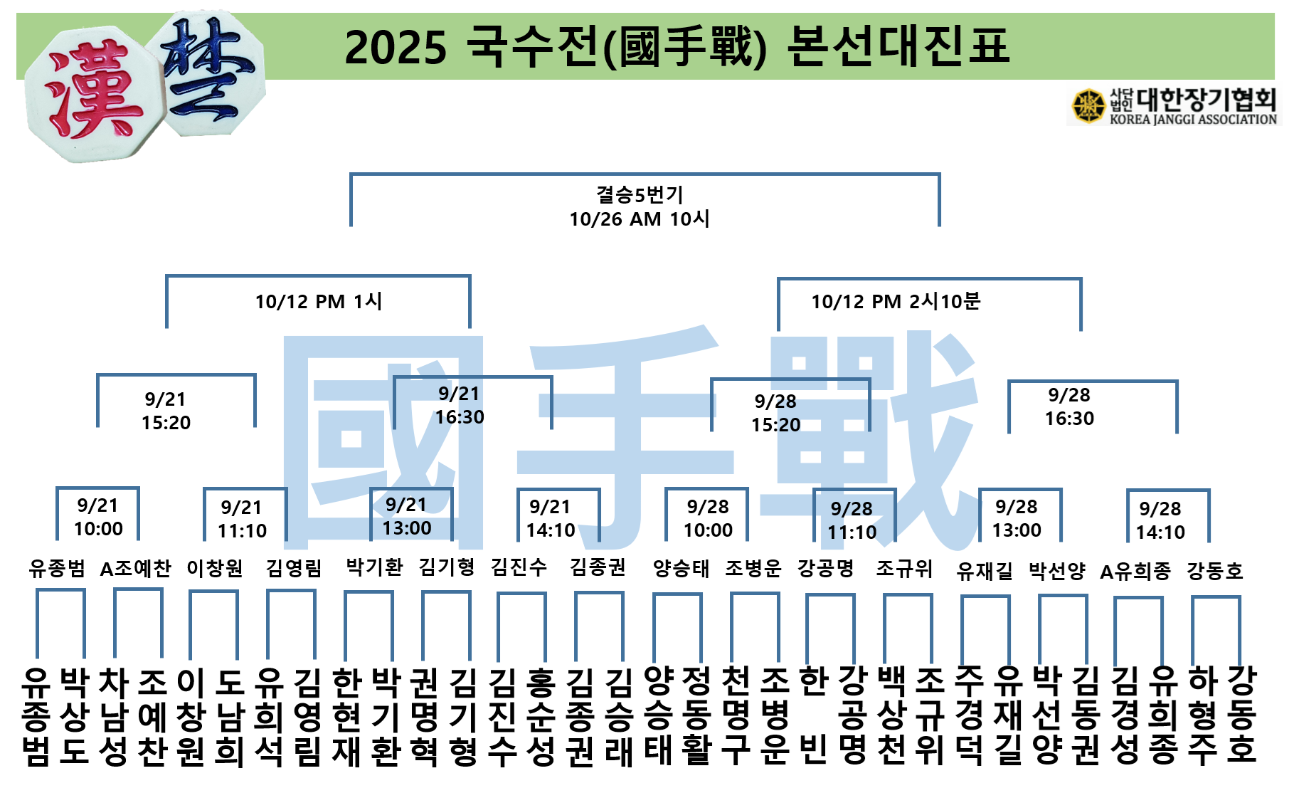 ¡°´ëÇÑÀå±âÇùȸTV¿¡¼ 9¿ù 21ÀÏ, 9¿ù 28ÀÏ, 10¿ù 12ÀÏ, ±×¸®°í 10¿ù 26ÀÏ °á½Â 5¹ø±â±îÁö— ½Ç½Ã°£ »ýÁß°è·Î ÇÔ²²ÇÕ´Ï´Ù.¡±